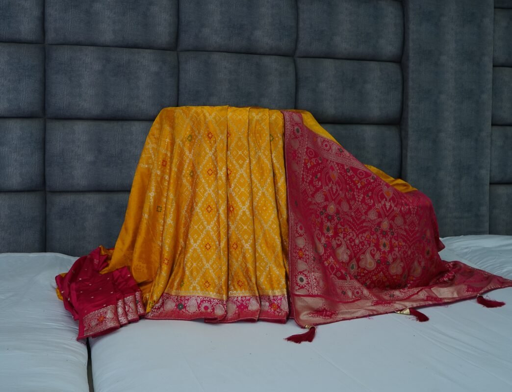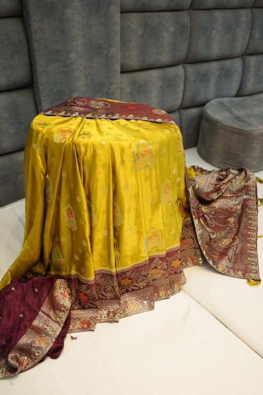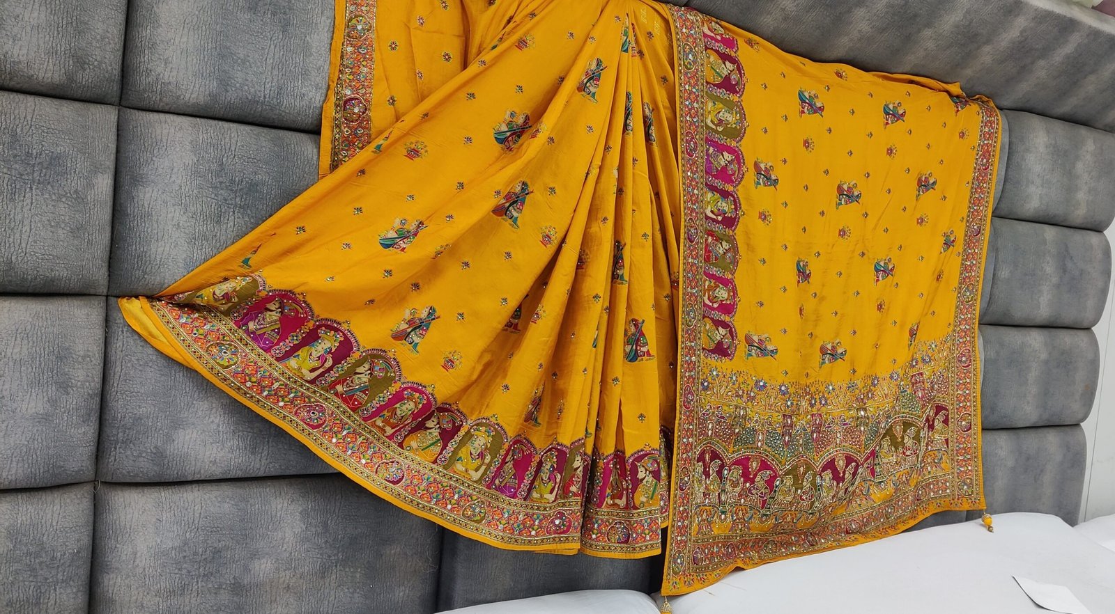 Elevate your festive wardrobe with this masterpiece of traditional craftsmanship. This magnificent Golden Yellow saree is a celebration of Indian heritage, featuring a breathtakingly detailed border and pallu that captures the essence of royal artistry.