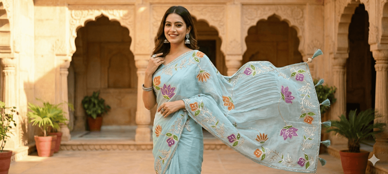 Embrace ethereal elegance with our new Azure Lotus Organza Saree. The perfect pick for your next day wedding look!