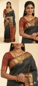 Command attention in this Charcoal Grey silk saree, contrasting with a rich Maroon and wide Gold Zari border. A luxurious, traditional South Indian statement piece perfect for any grand celebration.
